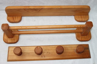 12 € le lot en pin massif avec attaches murales Comprenant: Porte serviette 50 cm x 15 cm Tablette 54 cm x 11 cm Porte manteaux 50 cm x 9 cm Excellent état jamais servi Pos