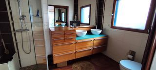 Meuble plan vasque 120/55 4 tiroirs en teck massif dessus plan vasques en verre vasques porcelaine equipe de mitigeurs neufs miroir avec double éclairage Leeds plus meuble attenant