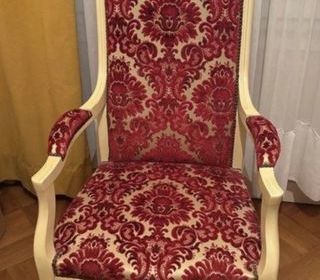 Fauteuil cabriolet de style Louis-Philippe retapissé tissu damassé rouge Description Elégant fauteuil cabriolet de style Louis-Philippe avec structure en bois laqué ton ivoire et