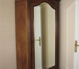 ancienne armoire bois de placage acajou/ Beau miroir biseauté/ étagères + 1 tiroir/ bon état général/ intérieur sain, de qualité. H 214 cm/ largeur 48 cm/ Longueur 1 m/ Très bel