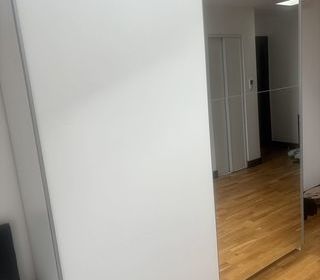 Je vends cette grande armoire (198x160x58 cm) avec cadre en bois. Bicolore design. Grande penderie et grandes étagères.