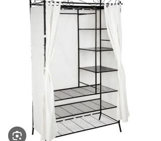Beaucoup d'espace de rangement. 7 Compartiments de différentes tailles. Protection contre la poussière grâce aux rideaux fixes. Tringle à vêtements. Haute stabilité. Peu encom