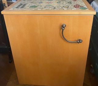 Le prix reste négociable pour ce meuble design de rangement en bois de chêne massif, neuf, dont le plateau est une oeuvre d'art faite main par artiste. Il contient énormément, je l