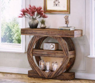 Console en bois massif au design circulaire rare et harmonieux, parfaite pour sublimer une entrée, un salon ou un espace de vie. Sa structure en double cercle symbolise l'équili