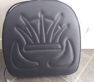 Coussin massant en cuir noir, équipé d'une prise électrique. Modèle compact avec design de couronne en relief sur le dossier. Plusieurs modes et intensités de massage.