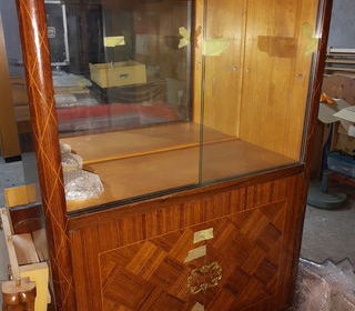 Buffet en bois avec partie vitrée supérieure et cabinet inférieur en bois massif. La partie supérieure est équipée de deux portes coulissantes en verre transparent permettant d'exp