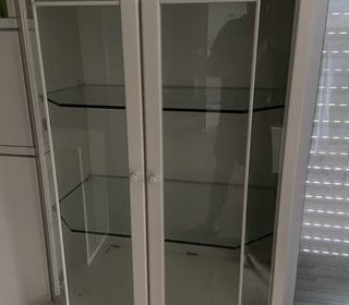Belle vitrine élégante de la marque Roche Bobois. Structure blanche avec portes vitrées et étagères en verre, idéale pour mettre en valeur vaisselle, objets décoratifs, livres ou