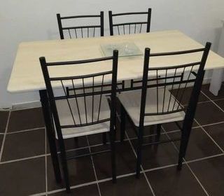 Table à manger avec 4 chaises, idéale pour la cuisine ou la salle à manger. Design moderne avec structure en métal noir et plateau effet bois clair, facile à intégrer dans tout