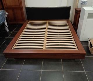 Lit double en bois avec sommier à lattes, idéal pour une chambre moderne et confortable. Structure solide et stable, avec une belle finition en bois et une tête de lit élégante. L