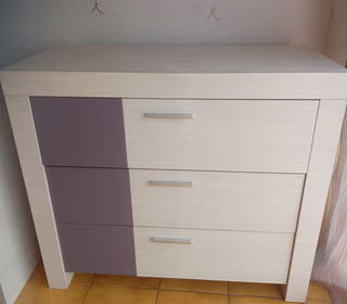 Ensemble SAUTHON EASY lit bébé évolutif avec les barreaux bi- colore opale et figue 140 x 70 Placard 3 tiroirs faisant table à langer 108 x 51 x 94 Petite tache au dessus du plac