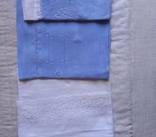 Parures de lit bébé, allant du landau (ou moise) au lit bébé. pour le moise l'ensemble se compose de : 1 couverture pure laine, 1 couette, 3 taies d'oreiller demi cercle, 4 taies