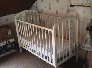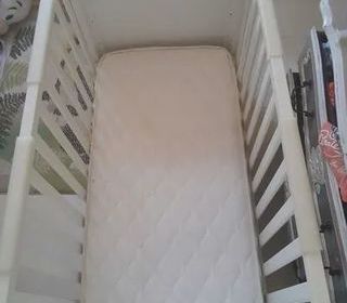 Vends lit bébé en bois de couleur blanc Marque Quax 3 niveaux de hauteur pour le matelas Vendu avec le matelas et 4 rails de protections Quelques éclats de peinture sur le cadr