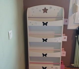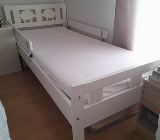 Vends chambre avec 2 lits enfants. Le lit bas: 2m×90, sommier en excellent état. Bois de lit impeccable. Lit mezzanine: 2m×1.80×1m. Hauteur de couchage: 1.60m. Avec étagère sur