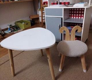 table blanche et très bon état , facile à nettoyer (notamment le feutre ou la peinture?) avec u produit ménager. Chaise douce en tissu metotonné avec dossier en corne de rennes, ex