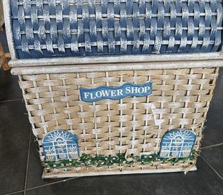 Je vends un coffre à jouets en osier peint avec couvercle . Anse ronde de chaque côté. Hauteur totale=85cm/largeur=49.5cm/Prof=35cm. Hauteur de la partie du bas=37cm. En bon éta