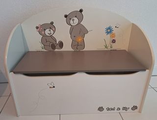 PAS DE LIVRAISON - trop lourd Joli et pratique coffre à jouets à l'effigie des oursons Ted & Lily marque DEMEYER permet à votre enfant de ranger ses jouets et de s'asseoir tranqui
