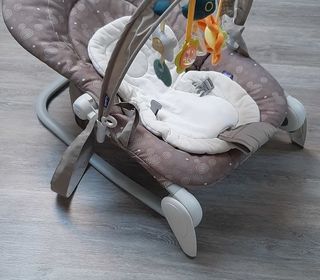 Transat bébé qui peut être utilisé en position fixe ou bascule. Siège inclinable grâce aux boutons latéraux Pliable et compact grâce aux 2 boutons latéraux Très bon état général