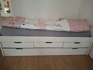 Lits superposés Vertbaudet en bois massif, très robustes, peuvent être séparés en 2 lits simples. Lit tiroir La Redoute. 3 couchages au total. Dimensions couchages : 90 x 190