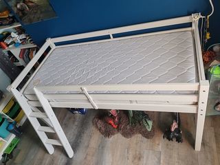 Bonjour, Je vends ce lit mi-haut avec échelle 3 barreaux + sommier + matelas + couette Le tout en très bon état, sans tâche. Hauteur 110cm Largeur 100cm Longueur 200cm