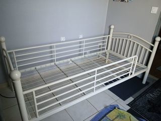 Lits métalliques blancs qui peuvent être utilisés superposés ou non. 90X190 cm Résistants ; mes petits-fils ont 16 et 14 ans. Donc dernièrement utilisés déssolidarisés