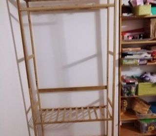 vds étagère très peu utilisée, jamais démontée, en pin clair, comprenant 2 étagères et 4 plots penderie.