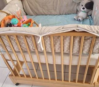 lit bébé 60x120cm blanc coulissant sur roulettes état impeccable avec tour de lit 40x180cm avec motif ourson +1 matelas anti -acariens jamais servie +un matelas sup avec -parure d