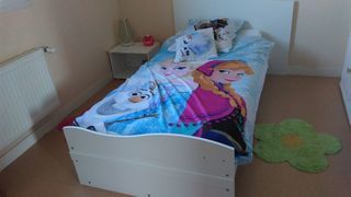 vend chambre enfant lit chevet armoire un coté penderie un coté étagère et petit meuble couleur blanche