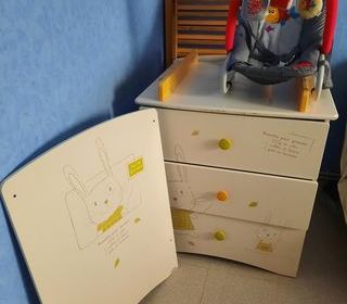 À vendre, table à langer pour enfant, en bois, avec décorations de lapins. Comporte deux tiroirs avec poignées colorées pour le rangement.