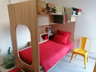 Vends lit "Gauthier" superposé enfant en bois clair, très bon état. Design moderne et pratique, idéal pour optimiser l'espace dans une chambre d'enfant Lit en hauteur avec coucha