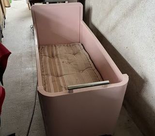 un lit enfant version dite baignoire des années 50/60 complet en excellent état avec son sommier et son matelas évidemment pas neuf. roulette en parfait état couleur rose mais
