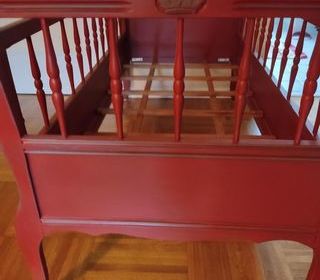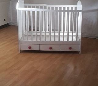 Bois de Lit enfant en bois cérusé bordeaux. Dimensions : longeur 1.40 m, largeur 0.70 m, hauteur sommier 0.40 m Pour enfant de 0 à 6 ans. Bon état. A retirer sur Ville saint Ja