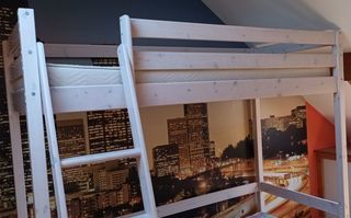 Solide mezzanine en bois, idéale pour gagner de la place dans une chambre. Structure stable, couchage 1 personne (90x190 cm). En bon état général, démontée et prête à être transp