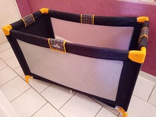 Vends lit parapluie en valise de transport (fermeture éclair HS) - Très bon état, couleur Bleu Marine/Jaune. Cédé avec matelas et un drap housse neuf.