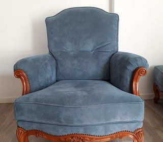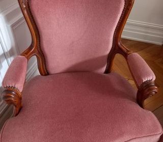 Très jolis fauteuils en très bon état et très confortable merisier recouvert velours rose poudré. Dimensions: L70 P70 H92. Peut-être vendu tous les deux ou séparément. Le prix p