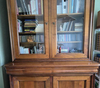 Bibliothèque 2 corps et 2 tiroirs réalisée en merisier massif. Style Louis Philippe Haut et bas démontables / Verre biseauté sur les portes supérieures Partie Haute : H 130 c