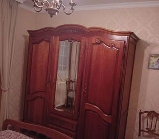 Armoire en merisier massif : Signée Christian Robert 2 portes, avec d'un côté une penderie et une étagère et de l'autre côté 2 étagères et un bloc que tiroirs en loupe de frêne Di