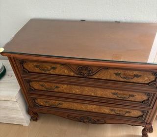 Commode en bois avec trois tiroirs, ornée de motifs décoratifs sur la façade et les poignées. Le dessus est protégé par une plaque de verre.