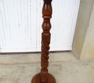 Piédestal pour plantes , luminaire, statuette ou autre, en bois tourné , forme de vis , teinté merisier. Socle : 28 cm de diamètre, plateau : 22 cm pour une hauteur de 92 cm Exp