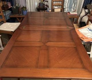 Table ovale en merisier massif fabriquée par un artisan. longueur : 158 cm + 3 allonges centrales de 50 cm : longueur max 308 cm. Largeur 112 cm hauteur 75 cm Permet de recevo