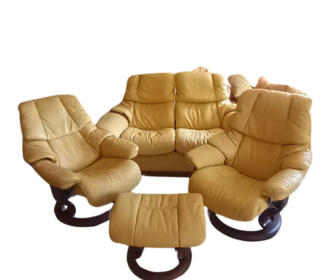 Salon en cuir jaune composé de 4 pièces: un canapé deux places (L 150 cm), deux fauteuils stressless et un repose pied. L'ensemble est très confortable et le cuir est en parfait ét