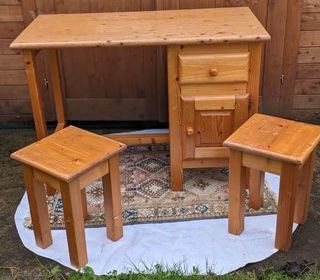 Bureau et ses deux tabourets, en bon état, à customiser, à repeindre. Pour adultes et enfants; avec un tiroir et un placard. Dimensions Bureau 110x55xH78. Tabouret 31x31xH45