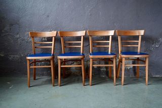Cette jolie série de 4 chaises bistrot est aussi simple qu'efficace. Les lignes sont franches et rétro, les assises en skaï bleu électrique apportent beaucoup de caractère et d'éne