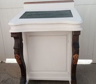 écritoire de style anglais "Davenport" vintage relooké. Il manque un tiroir que j'ai remplacé par une petite étagère. Le cuir du plateau est d'origine et très légèrement ondulé. Bo
