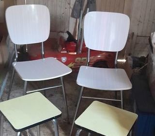 Paire de chiliennes en bois et tissus. Une est dotée d'un repose pied. Elles sont pliantes, ce qui est pratique pour le rangement, ou le transport. Vendues en lot ou séparémen