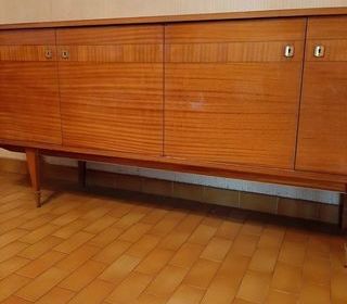 ENFILADE - en vernis polyester - meuble vintage - Longueur 2,20 m - largeur 48 cm - Profondeur 46 cm - Hauteur 94 cm - Hauteur du pied 34 cm - Bon état Le meuble Enfilade est