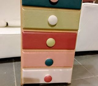 petite commode, environ 70 cm de haut, 5 tiroirs, repeinte de plusieurs couleurs, dans le style vintage.Très jolie dans une chambre d'enfant, ou autre.