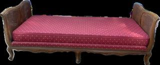 Belle banquette vintage en bois avec côtés et dossier en cannage. Solide, décorative, idéale entrée, véranda ou coin lecture. Coussin fourni