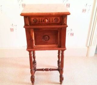 Chevet Henri II en chêne. ?Tiroir sculpté . ?Ouvrant à clapet avec intérieur en céramique . ?Tablette d'entrejambe. ?Pieds fuselé, cannelés et tournés . ? Marbre carré enchass