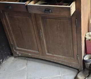 Buffet en bois avec portes et tiroirs de : 1 m de hauteur, 1,12 m de largeur, 49 cm de profondeur, Meuble solide avec deux tiroirs ouvert montrant l'intérieur. Possède des po