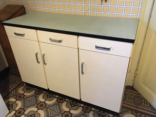 Meuble atypique de cuisine, blanc avec boutons d'origine, composé de 3 portes et 3 tiroirs + 2 étagères arrondies sur le côté. Plateau de couleur gris/vert. Très bon état et intéri